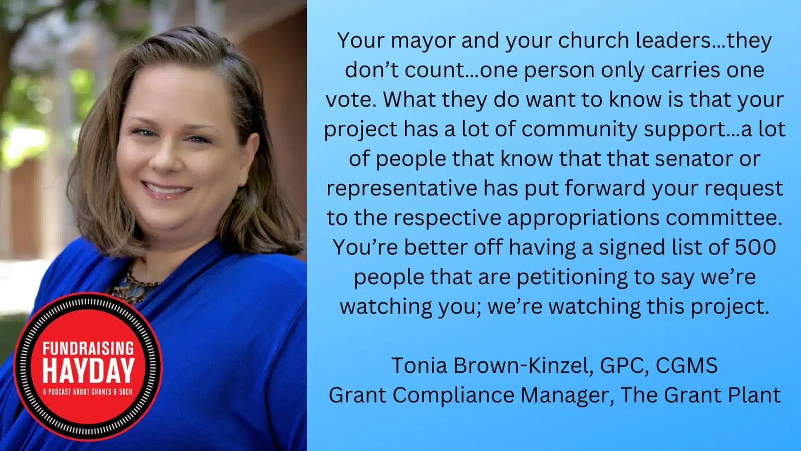 If your organization is looking to meet community needs for the benefit of the public, whether it be infrastructure or programming, you can ask your federal elected officials to legislate that project so Congress will send money to fund it. If this sounds familiar, it is. Years ago, it was called earmarks or federal appropriations, but around 2011 this funding source went away (or did it?). Join our very informative conversation with Tonia Brown-Kinzel, GPC, CGMS, for a history lesson on this funding source, plus a step-by-step process for participating in the new process, which is known as Congressionally Directed Spending.